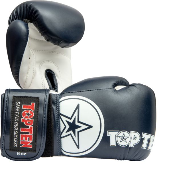 Boksarske rokavice “KIDS” TOP TEN prinašajo preizkušeno zaščito za vašega otroka. Oblazinjenje so z visoko kakovostno IMF peno. Oblikovane so po obliki otroške pesti in navajajo mlade športnike v pravilen položaj roke. Model “KIDS” se zapira z ježkom, ki ščiti občutljivo območje zapestja in zmanjšuje tveganje za nastanek poškodb. Oblikovane otroške boksarske rokavice »KIDS« so na voljo v velikostih 6 in 8oz. Na voljo sta dva modela s temno modro osnovo, v kombinaciji z rumeno ali belo barvo. Kot se za prvovrstni izdelek TOP TEN spodobi, je tipična zvezda bistveni del zasnove “KIDS”.
